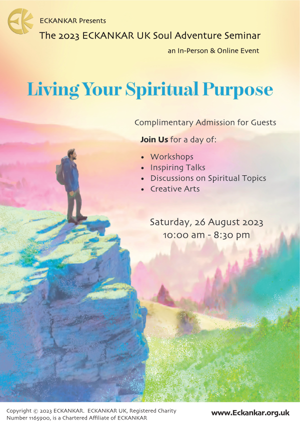 The 2023 ECKANKAR UK Soul Adventure Seminar Looking for spiritual community? Dive deep with others of like heart at an ECK seminar, and take life to another spiritual level. WHEN 26 August 2023 PROGRAMME Morning: 10:00am-12:00pm Afternoon: 2:00pm-5:00pm Evening: 7:00pm-8:30pm WHERE Trowbridge Civic Centre, Wiltshire Venue Information HOW TO GET THERE The Civic Centre is easily accessible by public transport and is located a 10-minute walk from Trowbridge Train Station and a short walk from nearby bus stops. Directions Google Map ACCOMMODATION There is a variety of accommodation within easy reach of the seminar. More information is available in the link below. Accommodation NEW TO ECK? BE OUR GUEST! This seminar can help you move forward spiritually as a divine light of God that shines with the certainty of life! Whatever your faith or background, come and discover more about your divine nature as Soul! The 2023 ECKANKAR UK Soul Adventure Seminar You are cordially invited to attend the seminar as our guest either in person or online (via Zoom). In Person Online Visit our “Guest Welcome” desk next to Registration in the foyer at the Civic Trowbridge for your name badge, programme, and guest welcome pack!